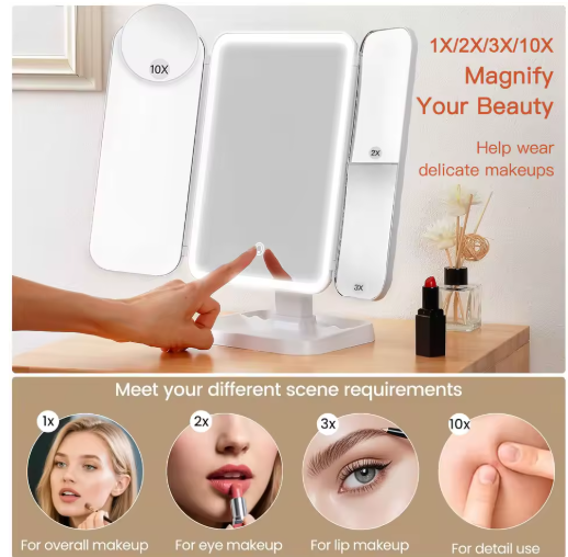 Trifold LED Makeup Mirror with Touch Control & 2X/3X Magnification – Bright, Lightweight & Perfect for Daily Beauty Routines